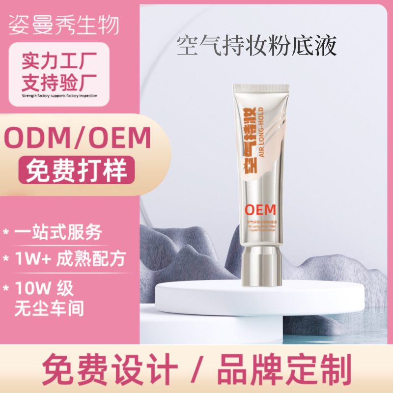 广州姿嫚秀生物科技有限公司专业提供空气持妆粉底液OEM/ODM服务。专为混干/混油皮研发,轻薄遮瑕二合一。一站式支持贴牌定制与小批量生产,免费打样,品质保障。